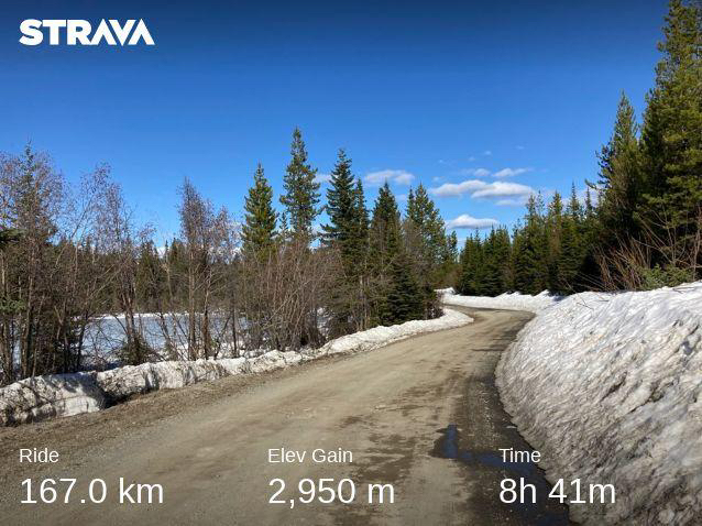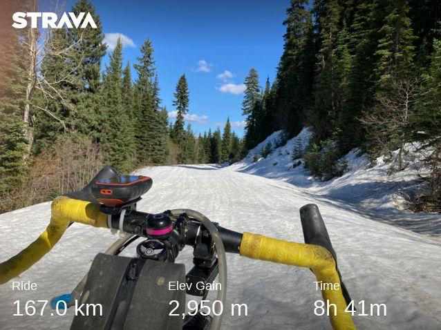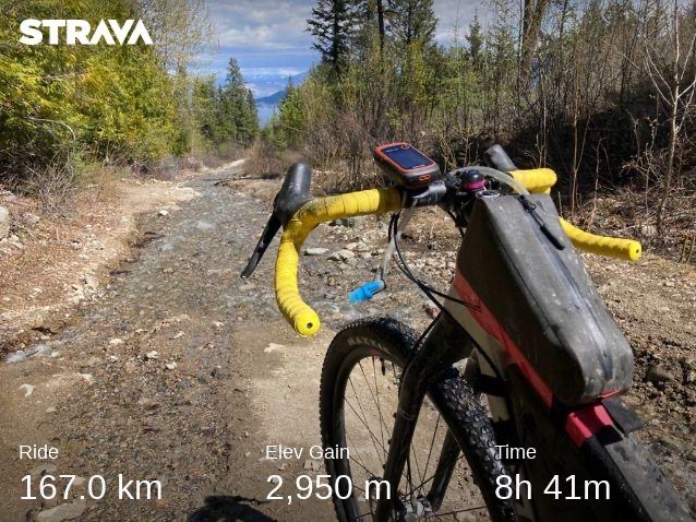 This early season mixed-surface century put me through the paces on my new Salsa Cutthroat. Out of town via Westside Road then up, up, up Bear Lake Mainline on washboard gravel. Welcome to the domain of off-road vehicles, dirt bikers, and pickup trucks; dust in your teeth and sun in your eyes. Turn right on Bald Range Creek Road for deeps woods and an obstacle course in potholes before descending back down to the lake on flowing creek bed. As a newbie off-road cyclist, I wasn’t sure how to handle water crossings: removing shoes and socks to wade through with my bike slung over shoulder seemed like the safest bet. But what is the protocol when trail literally transitions to steam? Despite my lack of technical skills, I opted to clip in for the descent, holding my breath until the route split from the creek to follow rough ATV tracks back down to the lakeshore. I followed paved Westside Road back to Bear Lake Mainline and climbed more chunky gravel until the snowbanks piled high and temperatures dipped below zero. At 1,450 metres—and without seeing another vehicle for hours—I filled my hydration reservoir in a stream and sped back to Kelowna, grateful for the stunning views over Lake Okanagan as my hands lost feeling on the jackhammer gravel descent. VIEW ON STRAVA