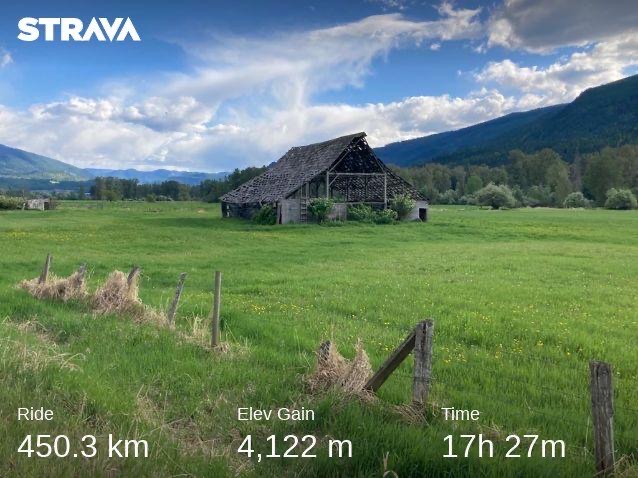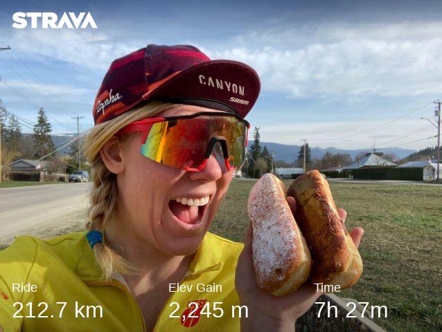I cooked up this 450 km monster of a training ride after successfully completing a 450 km route between Merritt and Kamloops last summer. Leaving Kelowna via Westside Road at dawn (3:36 am, to be precise), I tackled some hilly terrain in the gentle morning light (hills are smaller when it’s still too dark to assess them properly) before veering west on Highway 97 at the north end of Okanagan Lake. After a few noisy miles, I veered north on Yankee Flats, then followed peaceful backroads into Salmon Arm, the most northern point on the road. I managed to stay mostly off the highway until my first refuel stop in Enderby at—yup, you guessed it—Sutherland Bakery before heading east along the gushing Shuswap River until my turnaround point at Kingfisher marina on western shore Mabel Lake. I took five at the shoreline to pull out a sausage roll from my back pocket before hightailing it back to Enderby, making a giant letter “C” as I looped around the mountains through Vernon, Coldstream, and Lumby before tapping the southern tip of Mabel Lake near the provincial park campground. Mission accomplished, I turned my tires toward Kelowna, straight into the teeth of a mighty headwind that chewed me to pieces until I reached my front doorstep around ten pm. VIEW ON STRAVA