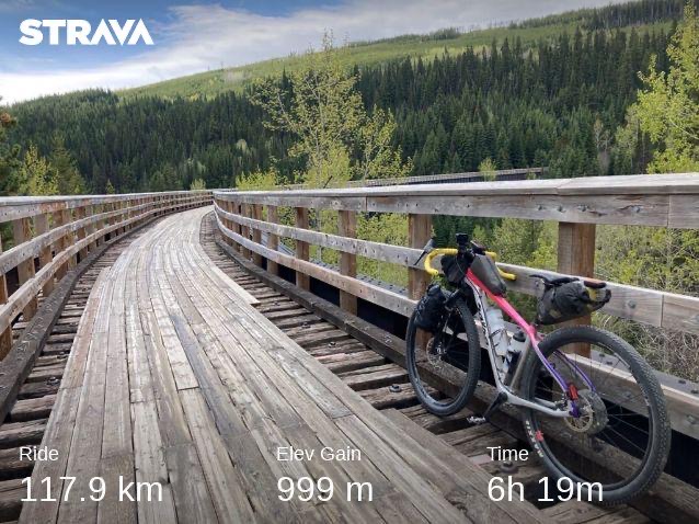 From my ride report on Bikepacking.com: “The BC Epic 1000 is a 1,040-kilometre (646-mile) off-road, self-supported bikepacking event between Merritt and Fernie, British Columbia, roughly following the Trans Canada Trail and gaining around 36,000 feet of elevation along the way. At first glance, the terrain doesn’t appear too formidable: the first two-thirds follow rail trail with grades topping out at two percent, while the final bit is a mashup of forest service roads, singletrack, and rail trail, with some pavement thrown in to link things up. The scenery is spectacular: with tunnels, trestles, and views of spellbindingly blue lakes; from the dry ranch lands and vineyards of the Okanagan to the lush green Kootenays, and further east to the untamed wilderness of the Rocky Mountains (think awe-inspiring peaks, rushing rivers, and grizzly bears). Some of the trail is in pretty rough condition, however, and a few special sections—including the technical, sandy singletrack connecting Castlegar to Trail, a 5,250-foot gravel climb up Gray Creek Pass, and a labyrinth of chunky forest service roads between Elko and the finish that I had the pleasure of navigating in the dark—make the course memorable.” VIEW ON STRAVA: DAY ONE, DAY TWO, DAY THREE