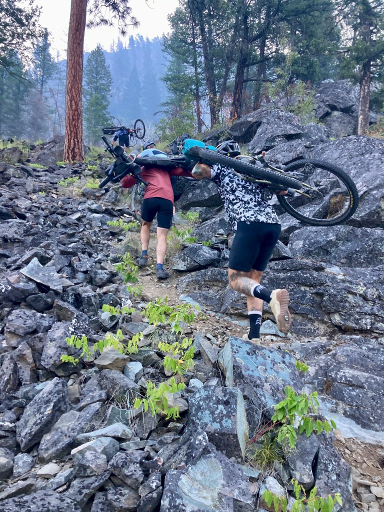 Despite being warned of the unexpected, I’ll admit that I didn’t quite realize that I’d be shouldering my bike for most of the 2,300-foot climb over Tegart Pass. About a third of the way up, I succumbed to the heat of the afternoon and laid down in a creek bed, cursing my own stupidity and willing my internal temperature to drop down to something manageable again. That’s how the fellow Okanagan bikepacker Jocelyn De La Rosa found me a few minutes later. It took all of two seconds for the delight in seeing his friendly, familiar face to replace my woeful thoughts, and within minutes we were trekking up the mountain together, laughing over the ridiculousness of it all as we took in the sights and smells of the woods. Despite being the first two riders in the field, we took our time on the climb: stopping to cool down as necessary and not pushing the pace. In addition to buddying up, I think lowering my expectations for myself and easing off the gas really helped me get through this challenging section without going into the red a second time.